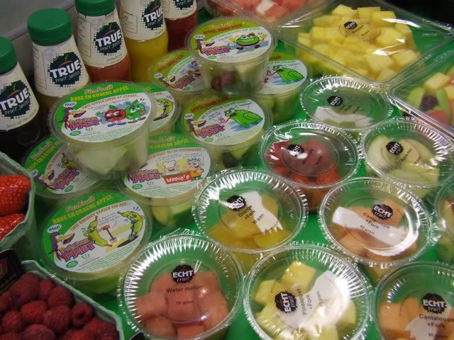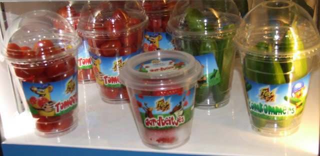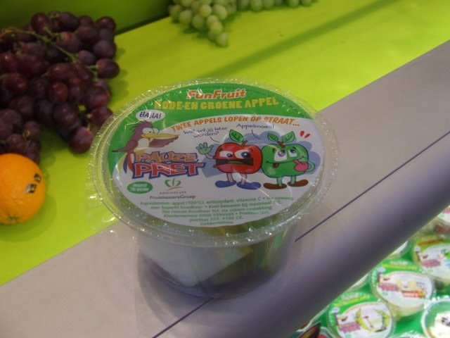 pret in de pauze met de fruitmopjes op de verpakking van het schoolfruit.