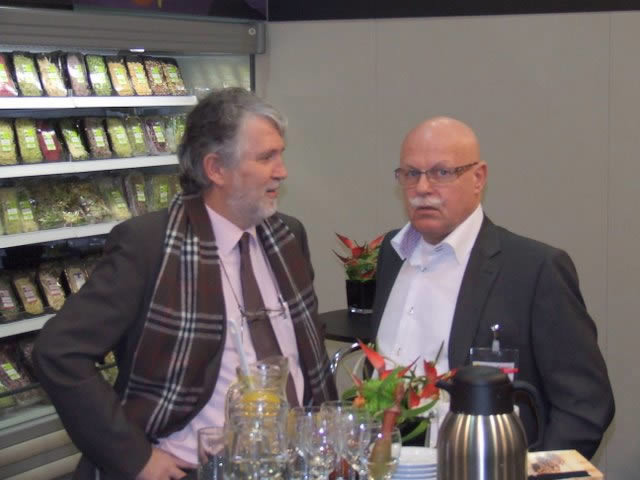 Johan Oosterbaan (l) en Theo Post (r) van Bud in gesprek.
