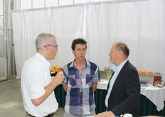 Bio-handelaren in gesprek. vlnr onder meer Jurgen van't Hoff (BioWorld), Gert Kogeler (Eosta) en Michel Groenewegen (2Organics)