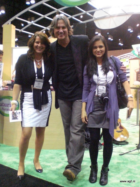 Dirian en collega Carolina van onze spaanstalige site Freshplaza.es met een zangers die speelde op de beurs en gesigneerde cd's uitdeelde