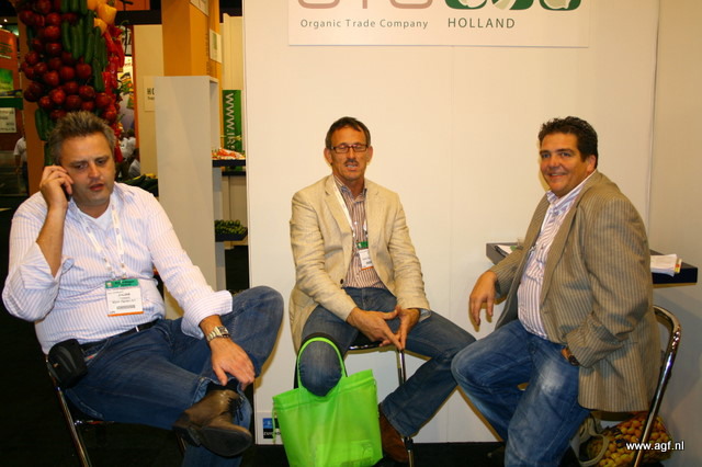 Fred en Marco van OTC in gesprek met klanten. De laatste jaren was het voornamelijk kidsmarketing wat de aandacht trok nu biologisch.