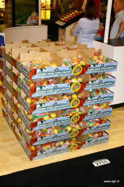 Deze pallet fruit kan zo de winkel ingereden worden. Iedere laag de kartonnetjes uit het midden weg