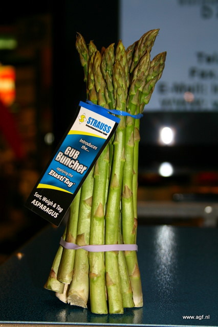 Strauss heeft een machine ontwikkeld die automatisch asperges van elastiek met label kan voorzien.