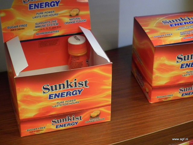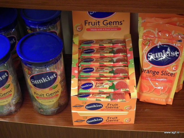 Sunkist gaat wel heel ver met het verwerken van citrus. De potjes bovenaan het schap is (sinaasappel) Vitamine C.