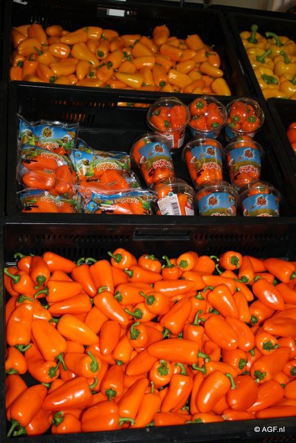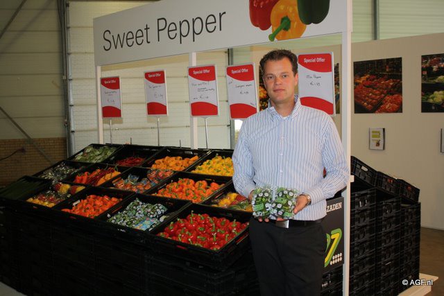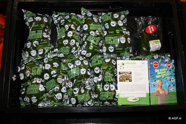 De zoete groene paprika Sweet Green zoals hij bij SuperQueen in Ierland wordt verkocht. Het idee is om in elke bak stickers mee nemen, zodat de communicatie thuis plaatsvindt.