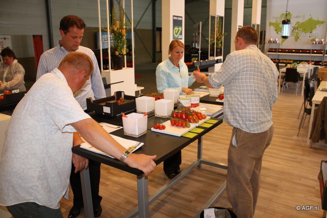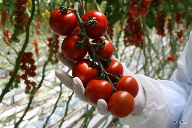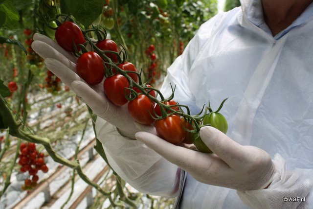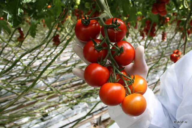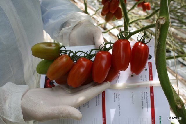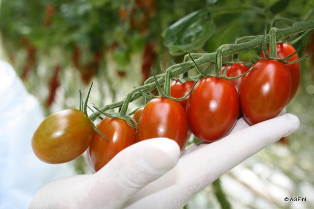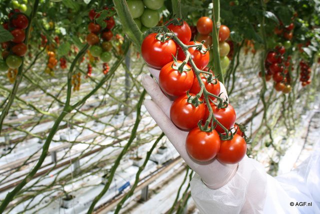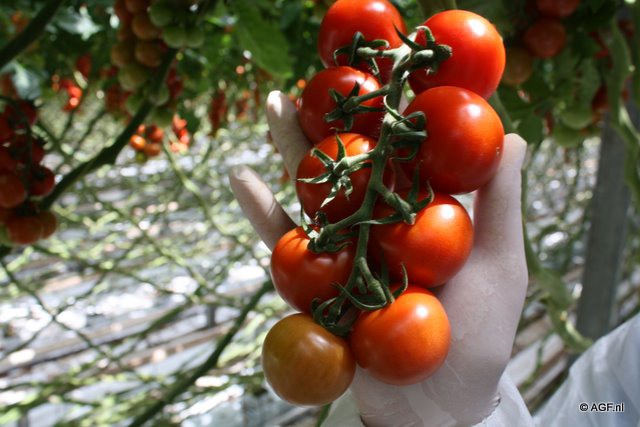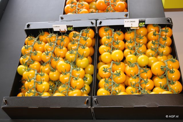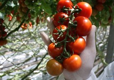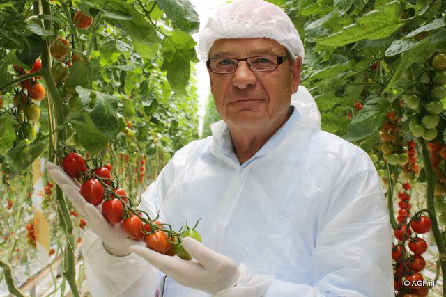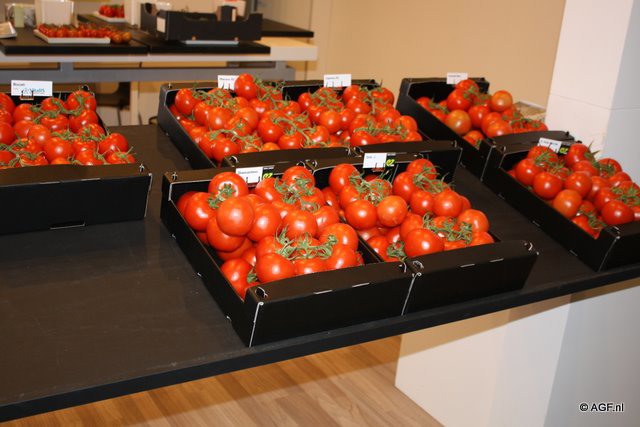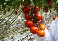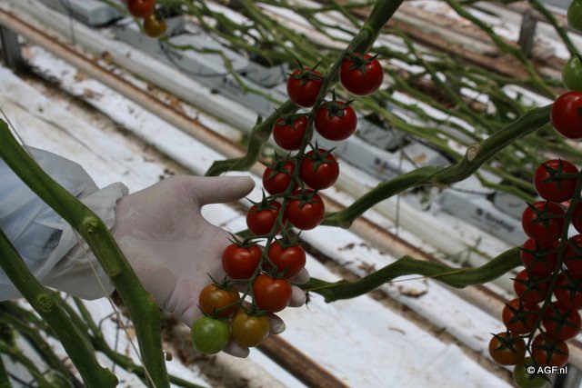Wim toont het welbekende ras Sunstream, al 10 jaar in de markt als smaaktomaat en nog steeds een gewild product