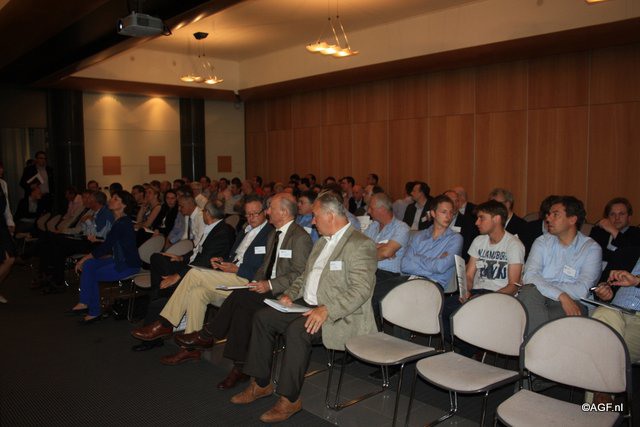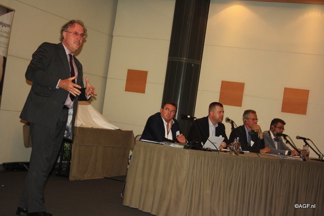 Romain Cools leidt het debat. Aan tafel V.l.n.r: Guy de Meyer (Demargro), Gino Vantieghem (Ruris), Vincent Marly (Pinguin) en Olivier Dauvers