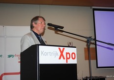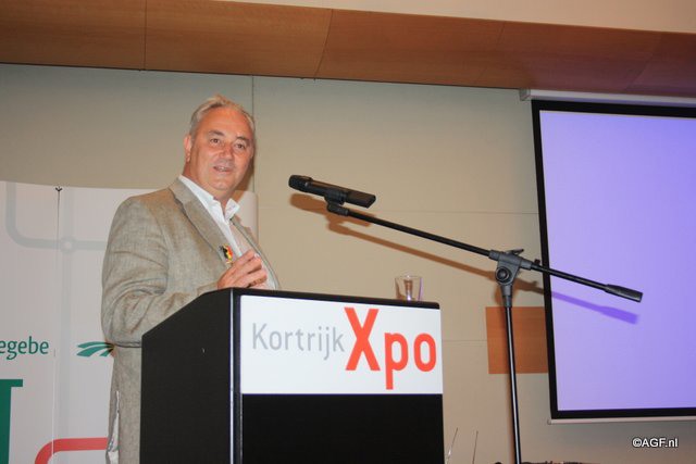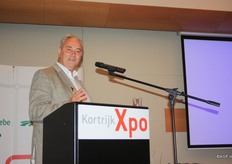 Bart Naeyaert, afgevaardigde afdeling Landbouw West-Vlaanderen spreekt de vertrekkende voorzitters toe.