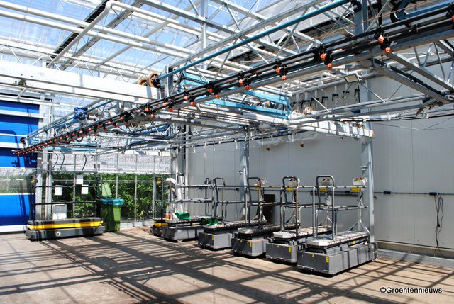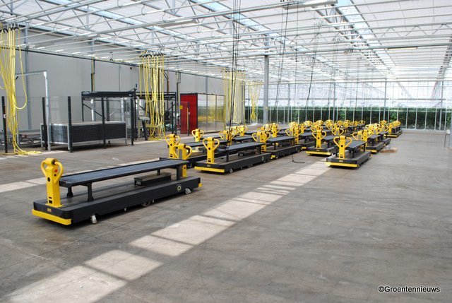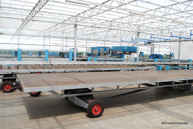Opslag voor de perkgoedteelt. Met de teeltwissel in november gingen de planten van hier uit in een moeite door de kas in.