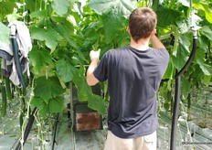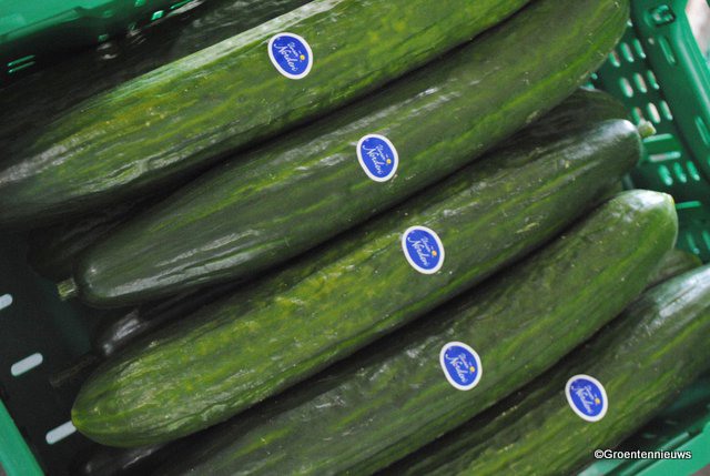 De sticker met daarop “Unsere Norden” wordt met de hand op de komkommers geplakt: ze zijn te klein voor het stickerautomaat. Best een karwei, maar de herkomst van het product is belangrijk om een meerwaarde te kunnen behalen.