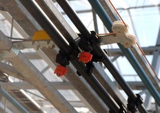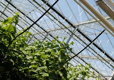 De kas is uitgerust met een dubbele scherminstallatie van Leen Huisman. Het tweede schermdoek is vereist voor de teelt van perkplanten. In de zomer wordt maar een scherm gebruikt. Bovenin de kas is het transportsysteem voor de perkgoedteelt te zien.
