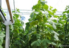 Met het transportsysteem gaan de komkommers automatisch tussen de tomaten door naar de verpakkingsruimte.