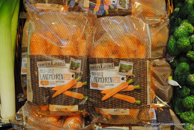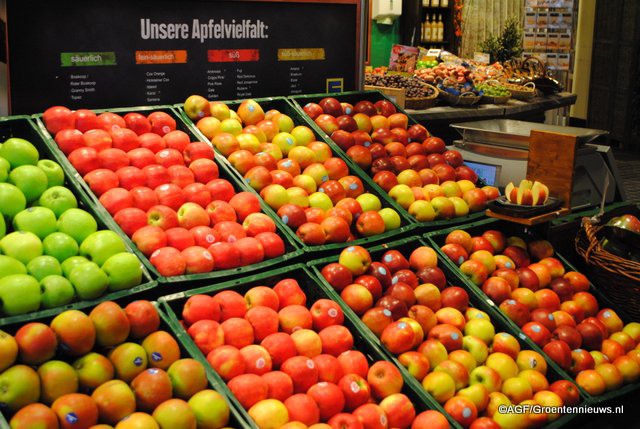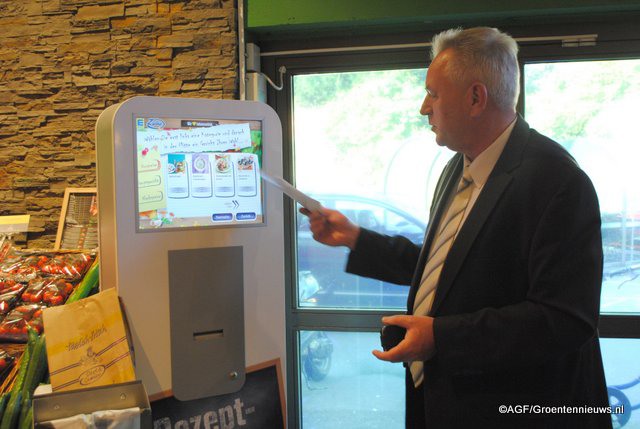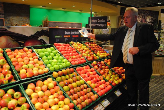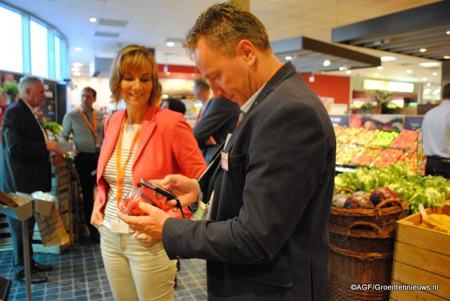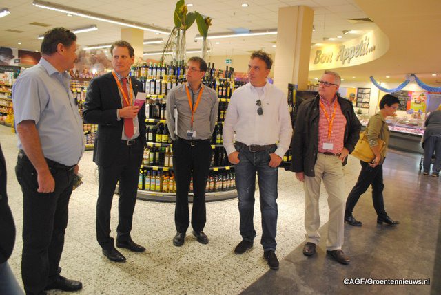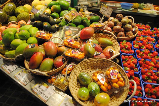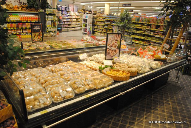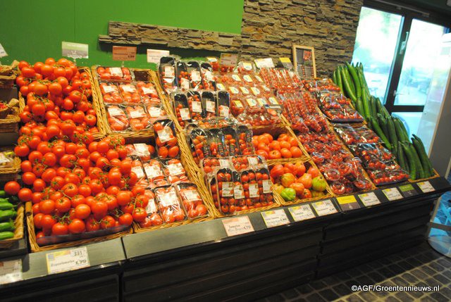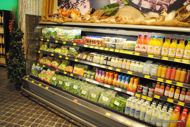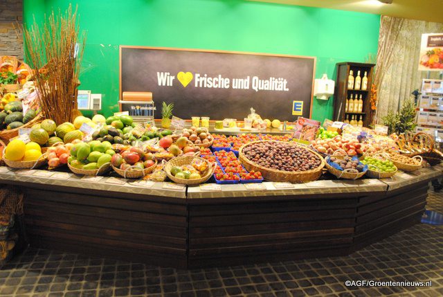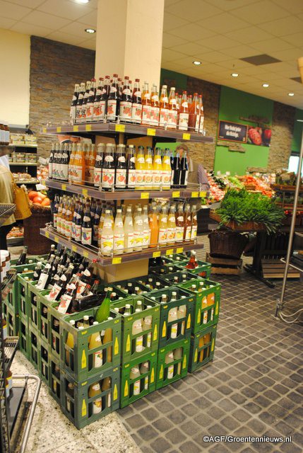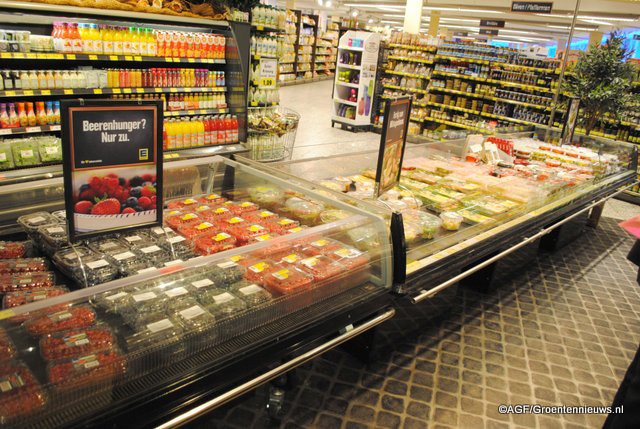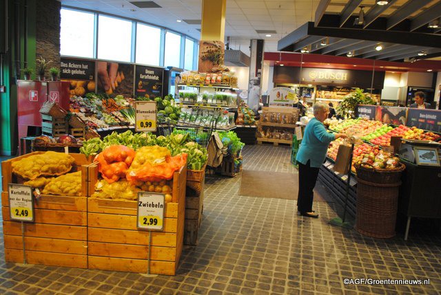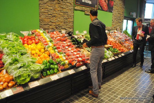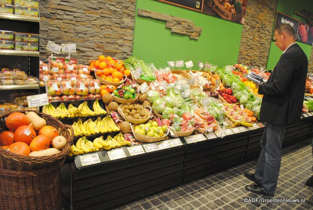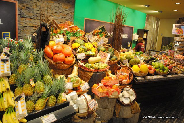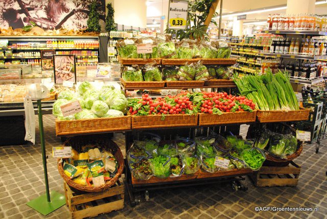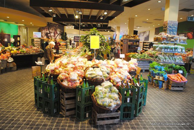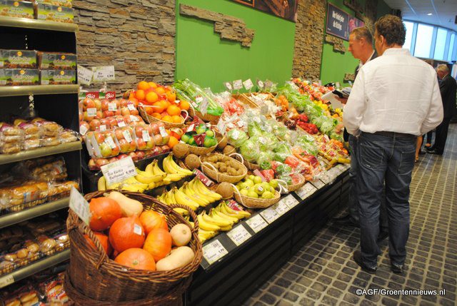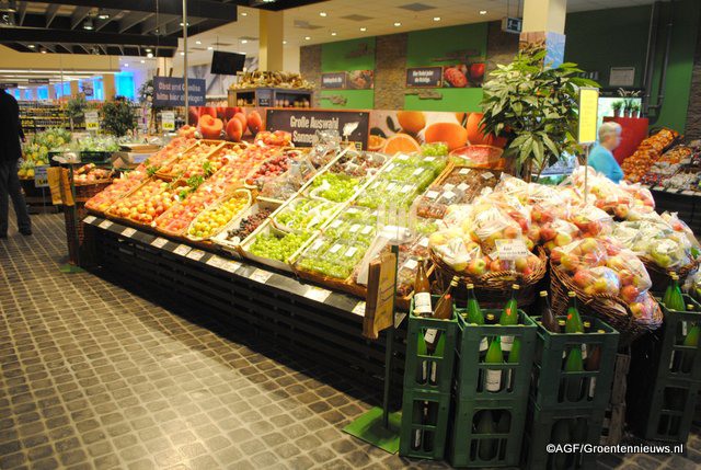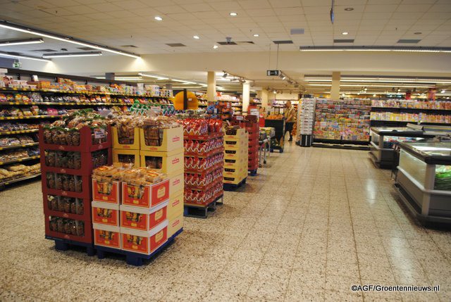 Bij binnenkomst van de supermarkt direct in de ruime AGF-afdeling.