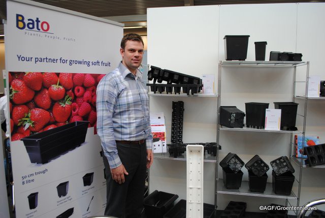 Edwin van Dorst van Bato plastics. Staan met 2 nieuwe aardbeientrays 1 van 12 gaats en 1 van 18 gaats en met hun nieuwe vierkante pot 7 liter.