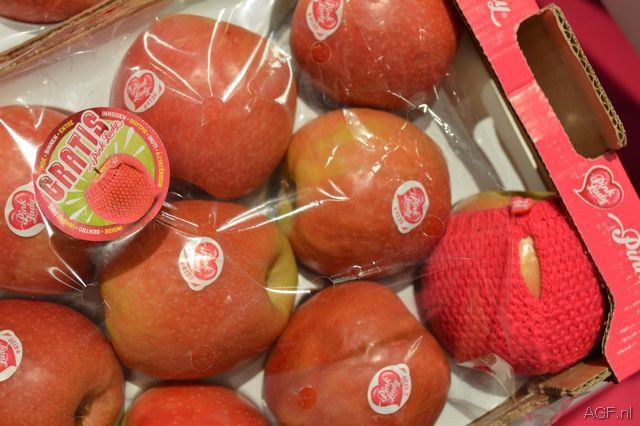 Een 'sok' voor je appel om te voorkomen dat die kou vat en ondertussen Pink Lady promoot.