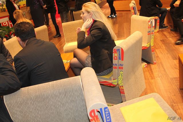 de stoelen in de stand van Dole lijken gemaakt van bananendozen