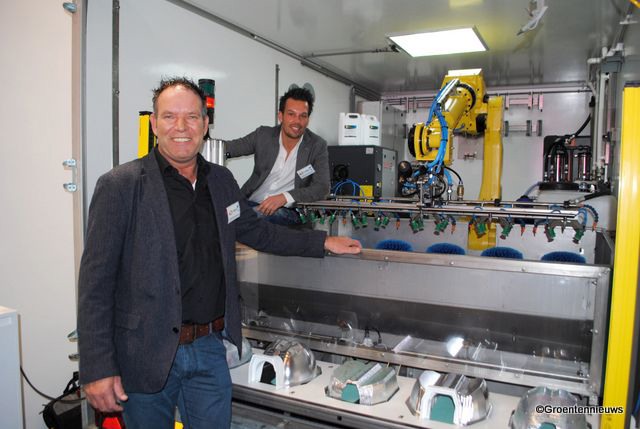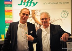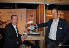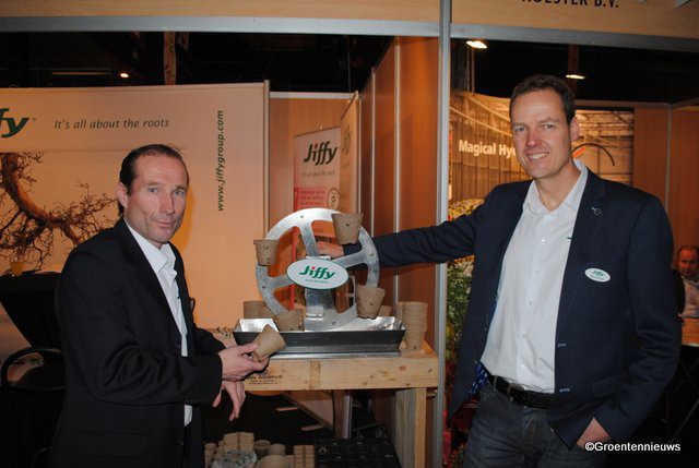 Sander Clemens en Marc de Bruin van Jiffy staan bij de nieuwe Long Casting Jiffy Pot met een uitgestelde vertering
