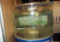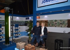 Meneer en mevrouw Jongkind van Jongkind BV. Links een buis waarin algen - die gebruikt worden als bodemverbeteraars - gekweekt worden.