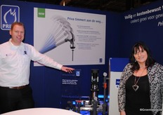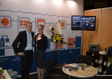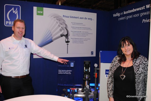 Peter Koneman en Wilma van der Lely van Priva. Priva timmert aan de weg met de Priva TopCrop gewasmonitor en MD/AV-desinfectiesysteem