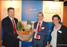 Frank Buiks, Maarten van der Linden en Esther van de Wijngaard van ABAB Accountants. Hier kunnen de bezoekers raden hoeveel de groentemand weegt.