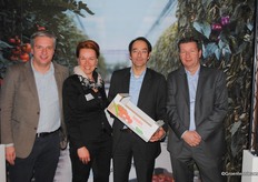 Michel Klaverdijk, Lyenne Nabuurs, Remy Notten en Lauran Jansen van Smurfit Kappa met hun nieuwe verpakking voor meer info: http://www.agf.nl/artikel/121676/Innovatie- The-Greenery-tomaten-verpakt-in-eigen-stengels