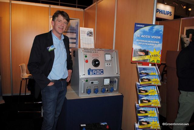 Erik den Drijver op de beurs voor Santen & Gasille. Hij krijgt bezoek van H. van der Stok van United Trojka en Ron Abrahams