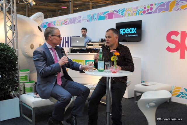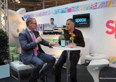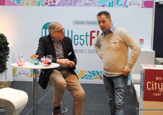 Martijn Fluyt van Smart Packaging Solutions. Hij maakt hier een babbeltjes met de overbuurman Toon Hopmans.