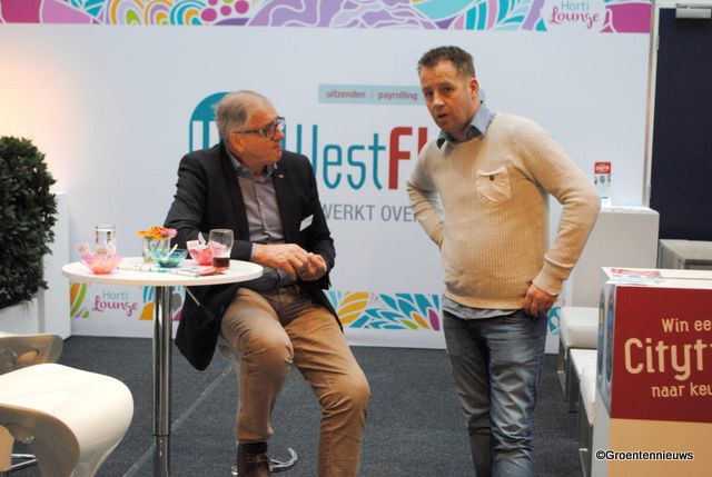 Nic Poot (links) discussieert boven in de Hortilounge over arbeidsrecht