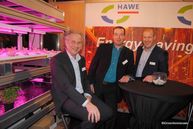 "Mike Zwinkels en Art van Rijn van Artechno en Aerosol en Chris Noordam, die natuurlijk wel het logo "Build for Dry Hydroponics" op de foto wil."