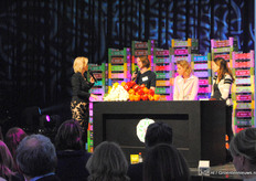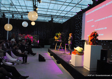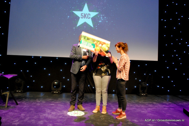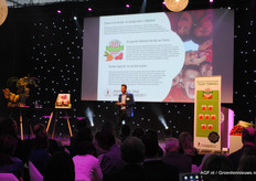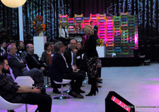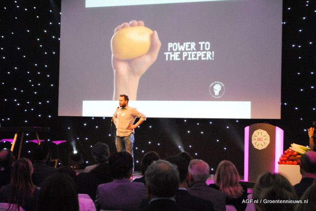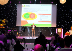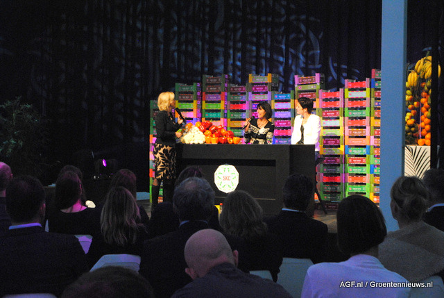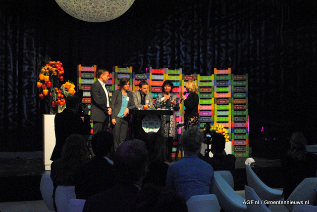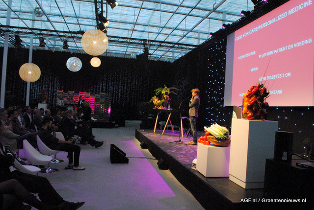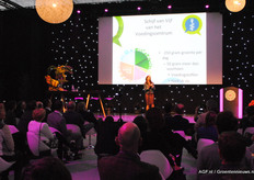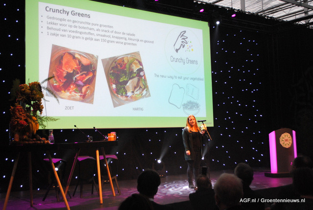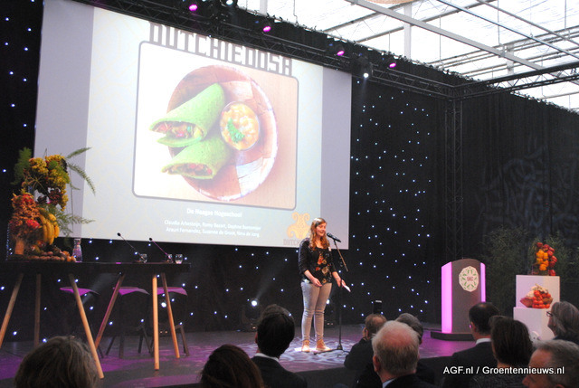 De uitreiking van het Beste Groente Idee van Nederland. Suzanne de Groot pitchte over de Dutchie Dosa: een vegan wrap op basis van kikkererwten, gevuld met groente.