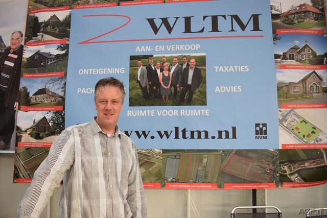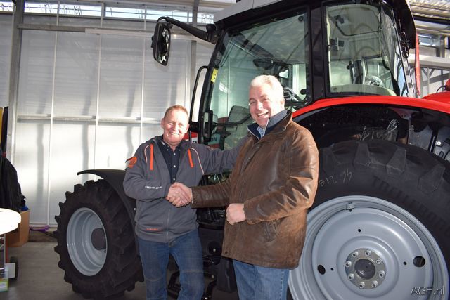 Peter van Heijst (l) van Dick Klok Mechanisatie BV schudt de hand met teler Wim Lageweg (r)