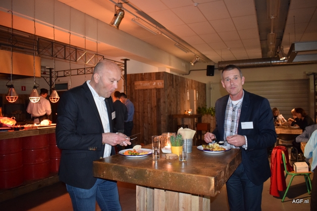 Het afsluitende buffet smaakt goed volgens Marcel Denkecke (l) van Van Kempen Koudetechniek en Arie van Os (r) van 't Web.