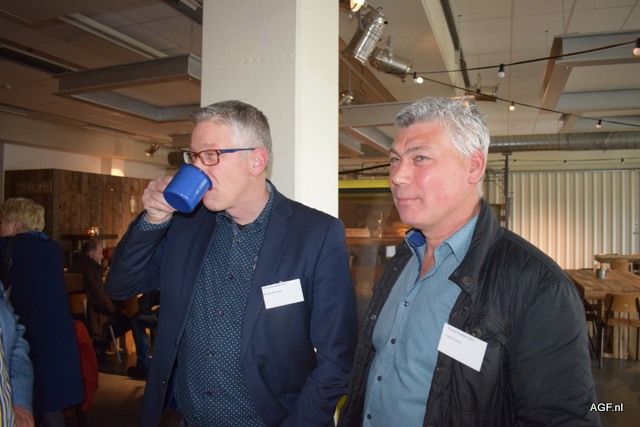 Lei Matthijssen van Matthijssen VOF en John Wijnen van Riny van der Staak B.V hebben plezier tijdens ontvangst met koffie