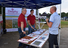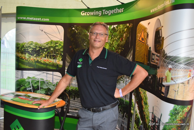 Peter Kuijlen van ZHE Trading in gesprek over de mogelijkheden van de opvallende blauw-gele combi in de aardbeien