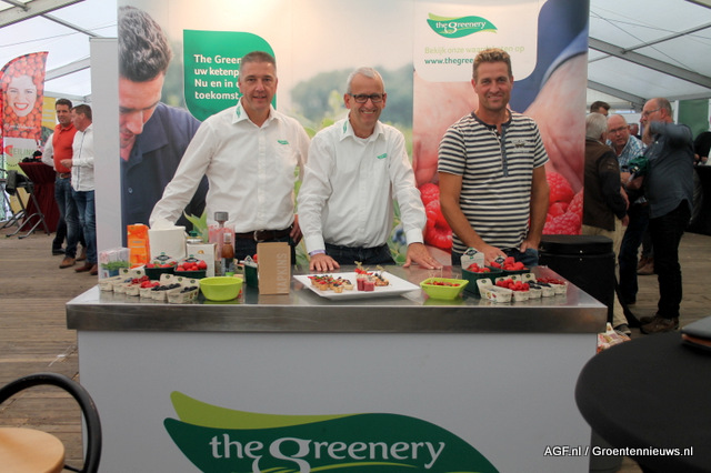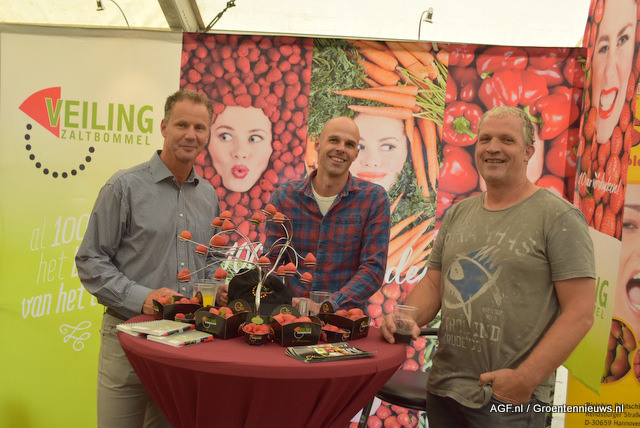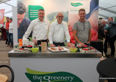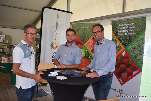 Rob van der Weele en Johan de Jongh van The Greenery met hun gewaardeerde aardbeienteler Johan Vermeeren.