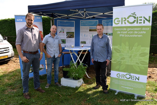 Mathijs, Johnny Visser en Bert Evenhuis laten zien wat ze met PPS Groen doen: een basisbescherming in de biologische gewasbescherming tegen onder andere schimmels realiseren en enkel als nodig chemisch aan de slag. Dat doen ze met name door de plantweerbaarheid te verhogen.