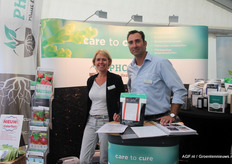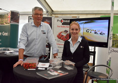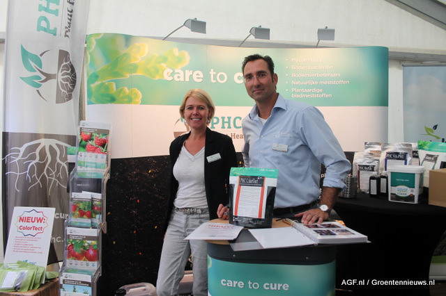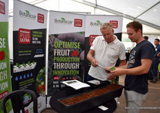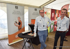 Dominique Stephan en Raymond Notermans van Plant Health Cure. Zij hadden ColorTect meegenomen. Een natuurlijk spuitmiddel op eiwitbasis (gebruiken in het laatste stadium voor de pluk) voor betere kleuring, hogere brix waarden en betere en langere bewaring