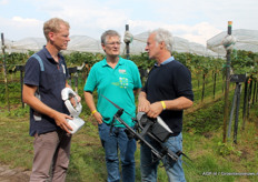 Bert Geeraets (r) geeft uitleg over de mogelijkheden aan John Bal van ZLTO en Erik Peters voorlichter in de aardbeien. John is adviseur voor het ICAReS project