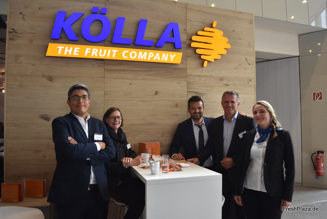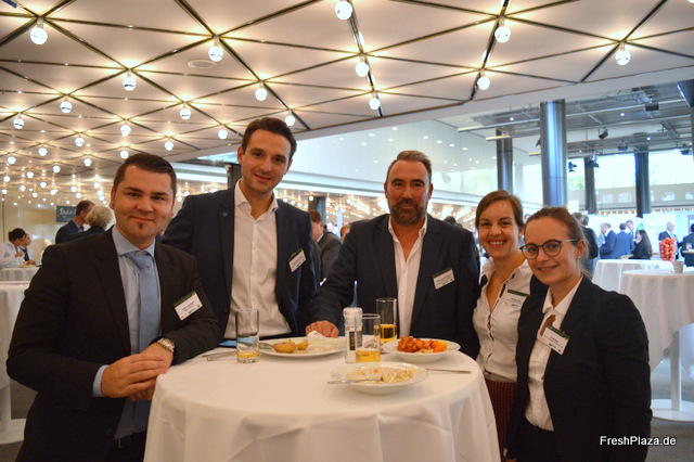 Aan deze gezellige tafel staan Artur Lammert van Walter Port, Christoph Buchner van Hausladen, Hans-Jörgen Kirsch van Bürling en Stefanie en Alma Riel van Riel Fruchthandel
