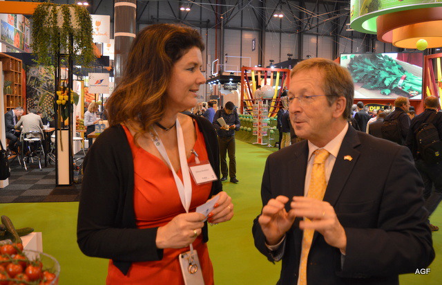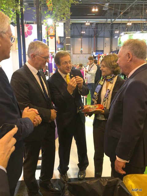 Matthijs van Bonzel, de Nederlandse ambassadeur in Madrid, bezocht de Fruit Attraction. Bij veel Nederlandse deelnemers toonde hij interesse voor hun bedrijf en producten. Axia is veredelaar van tomatenzaden. Melissa Bontekoe in gesprek met de ambassadeur.