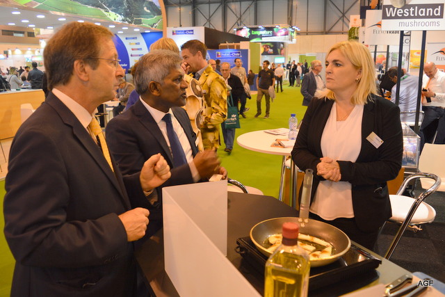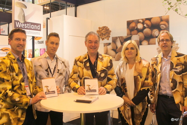 Het beursteam van Westland Mushrooms met Harold Schuurmans, Alex Vos, Rob Banken, Desiree Janssen en Marco Koster. Westland Mushrooms nam voor het eerst deel aan de beurs. Op de stand werden paddenstoelen bereid, die volgens Harold goed in de smaak vielen door de bezoekers. De consumptie van paddenstoelen neemt volgens hem nog altijd toe.