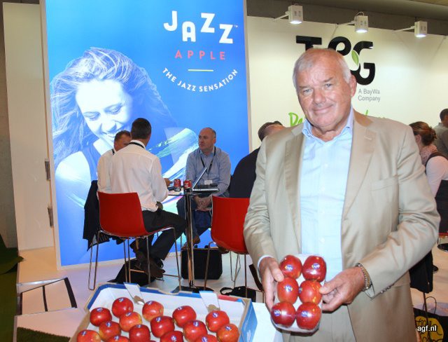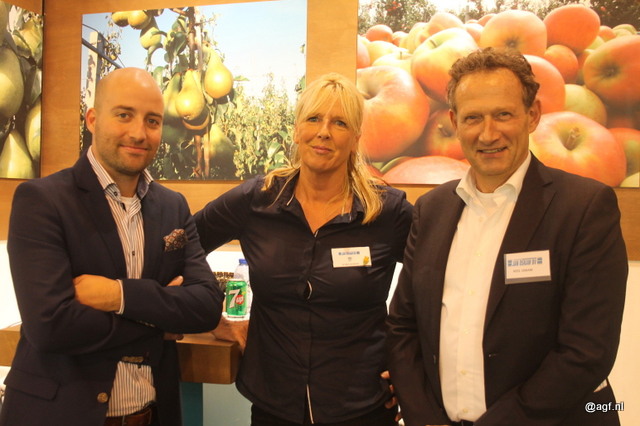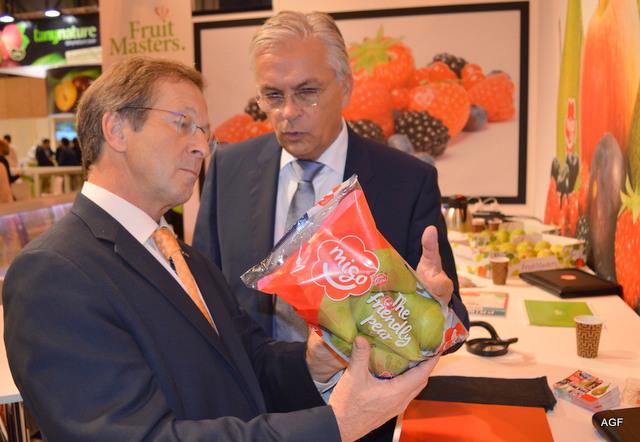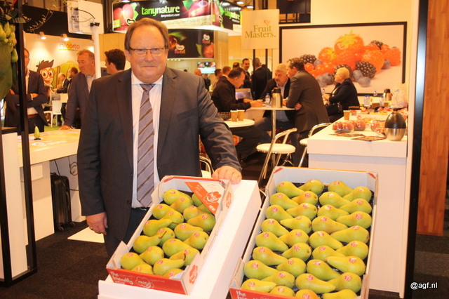 Urs Luder van GKE in de stand van Fruitmasters met Migo. De peer wordt vermarkt door Fruitmasters (Nederland) en BelOrta (België).