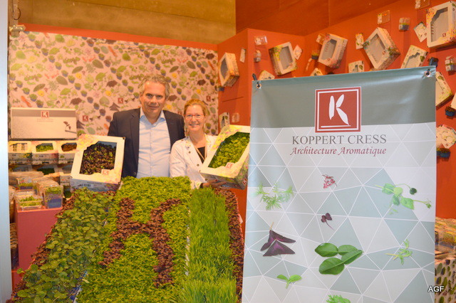 Annette Abstoss en Bart Leemans van Koppert Cress. De nieuwe verpakking krijgt extra aandacht op de beurs. Deze verpakking geeft een betere productpresentatie en verhoogt de houdbaarheid. Met een kleurenschema op de doos wordt duidelijk gemaakt welk smaakprofiel de cressen hebben.