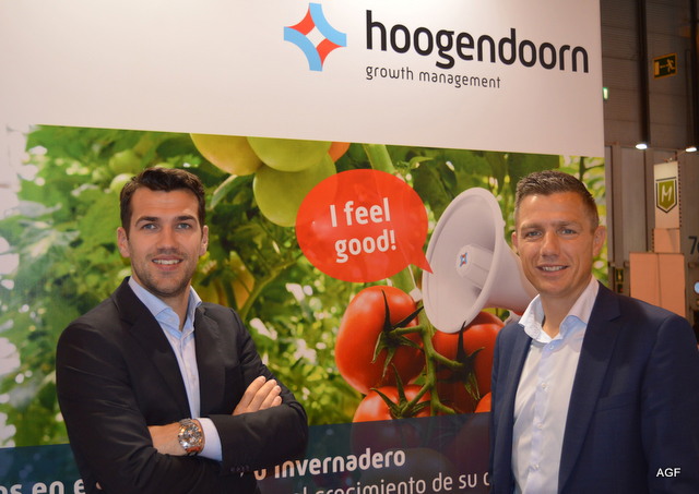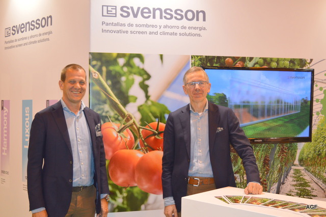 Pieter Mol en Hugo Plaisier van Svensson. Zij staan voor de derde keer op de Fruit Attraction. Het bedrijf levert beweegbare schermen om het kasklimaat te optimaliseren. Een voorbeeld is een doek met de naam ‘Harmony’. Dit type doek geeft schaduw en verspreid het licht. Hierdoor een betere kwaliteit en hogere opbrengsten van kasteelten.