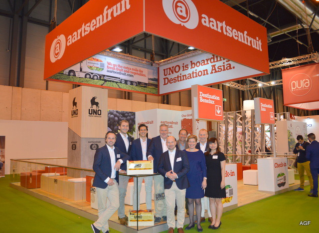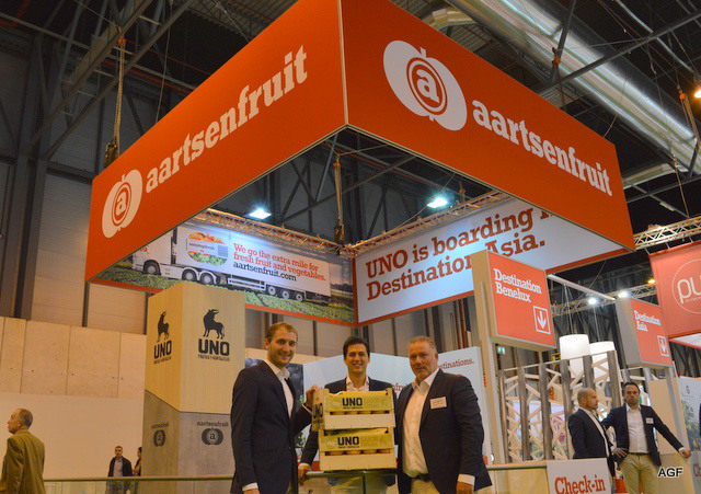 Jasper van der Sandt, Menno van Breemen en Richard Uytdewillegen van Aartsenfruit. Uno is boarding now. Destination Benelux and Asia.