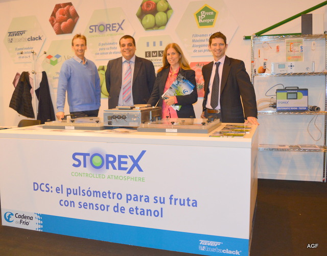 Wilfried van Gijsel, Marc Ribert, Silvia Ribas, Eugene Rokx in de stand van Cadena del Frio. Dit bedrijf vertegenwoordigt o.a. Storex. Storex is leverancier van klimaatbeheersingssystemen en ULO bewaartechniek.