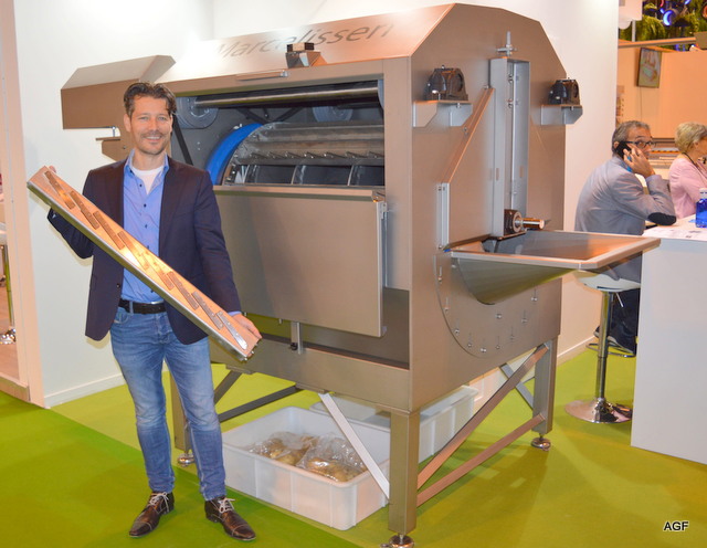 Jean Paul Arends van Marcelissen bij een trommelschiller. Deze machine schilt knolgewassen zoals aardappelen, knolseldeij en rode bieten. De machine is uitgevoerd in RVS waardoor hij goed te reinigen is. De machine is sterk en robuust. Hij heeft uitneembare messenbalken en een hygiënisch ontwerp.