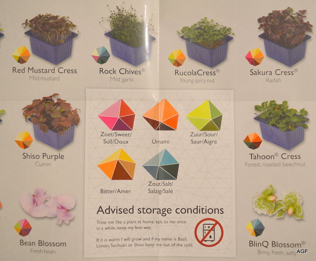 Koppert Cress: Met een kleurenschema op de doos wordt duidelijk gemaakt welk smaakprofiel de kruiden hebben.