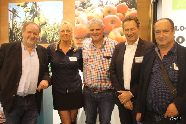 Hardfruitspecialisten onder elkaar: Jos Derwael (New Green), Elvira Schipper (Jan Oskam), Tony Derwael (New Green), Kees Oskam (Jan Oskam) en Jos Claes (New Green)