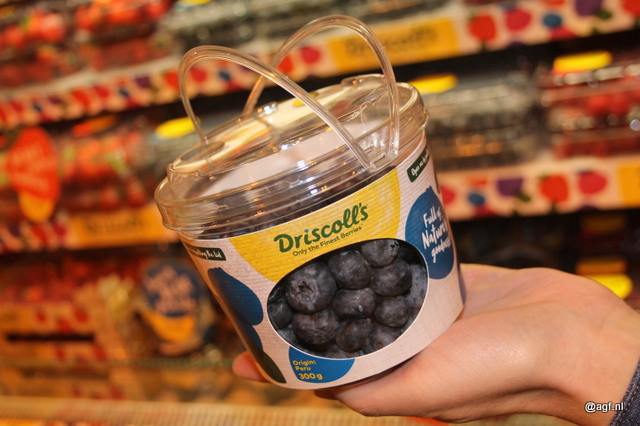 De nieuwe 'baby' verpakking voor blauwe bessen. Het hersluitbare emmertje van 300 gram is gemakkelijk mee te nemen.